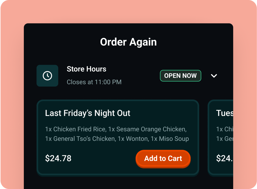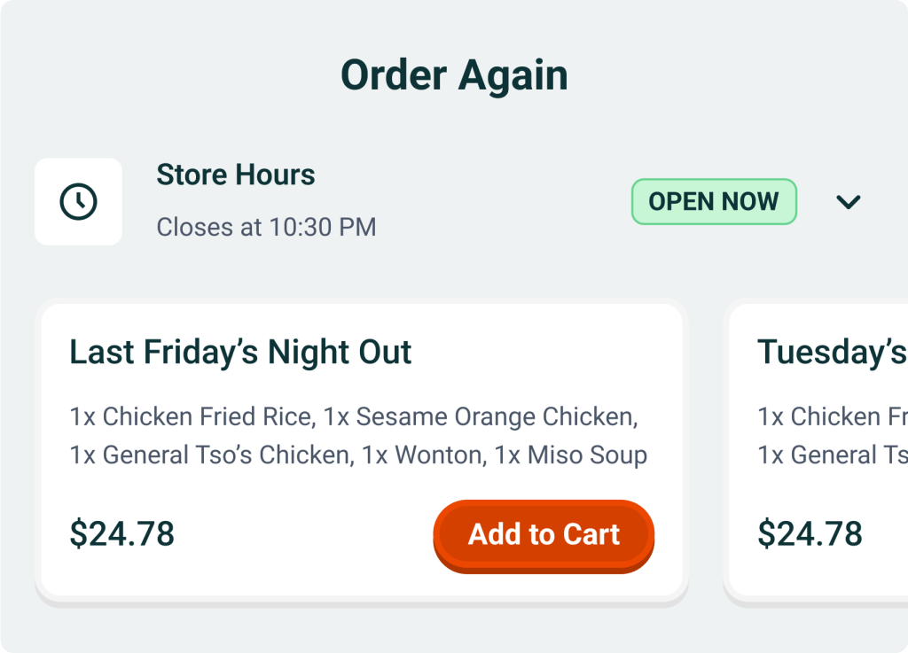 Your loyal diners see your restaurant first when they open the app, making it easy to order (and reorder) their favorites in just a tap.